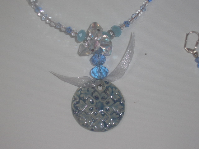 I made a necklace with the snow flake focal, I wire wrapped it with some crystals, and hung in from a strung necklace of multiply shades of blue crystals and silver beads, I put some crystals on head pins and clustered them on either side of the focal and randomly in other places on the necklace. I also added a bit of the ribbon from the kit to the pendant. I also made a bracelet in matching colors with a center piece of clustered lucite flowers with crystal centers . And a pair of earrings featuring the snow flake links and crystal drops...